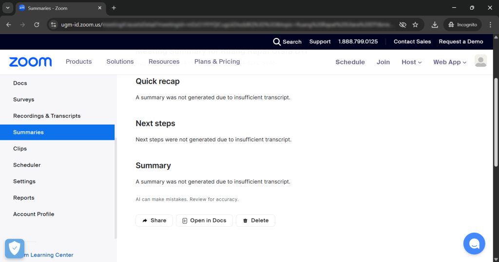 • Ringkasan Otomatis: Zoom AI Companion dapat membuat ringkasan otomatis dari rapat yang telah selesai, menyoroti poin-poin penting, tugas yang ditugaskan, keputusan yang diambil, dan diskusi yang relevan. Fitur ini dapat diakses melalui zoom.us (Akun host) pada menu Meetings (Attachment) atau menu Summaries. Ringkasan otomatis tersebut dapat dikonversi ke Zoom Docs.